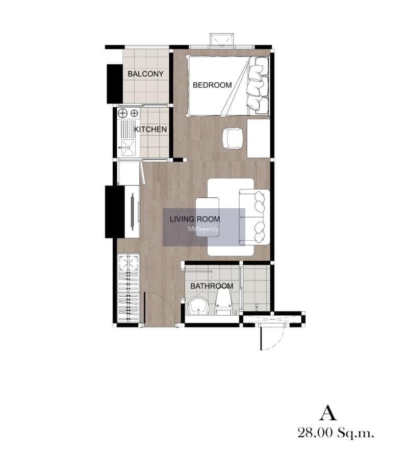 - รูปแบบห้อง 1 ห้องนอน 1 ห้องน้ำ