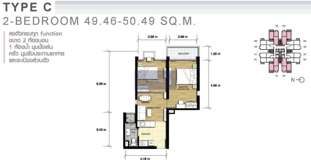 - รูปแบบห้อง 2 ห้องนอน 1 ห้องน้ำ 1 ห้องนั่งเล่น + ครัว